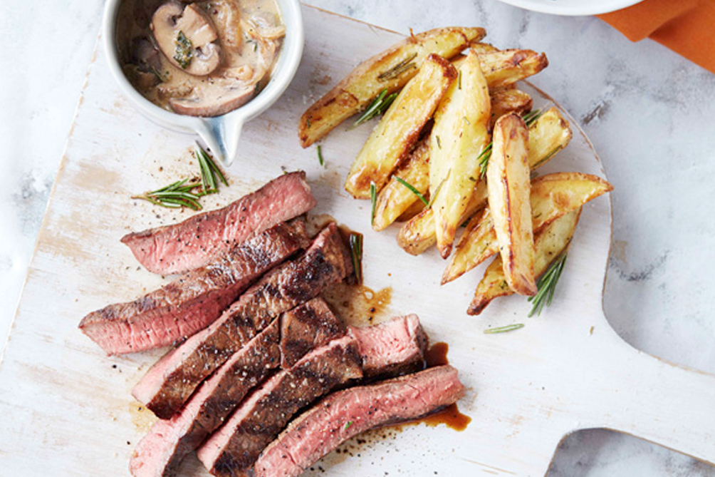 5. Heat a lightly oiled bbq or chargrill pan over high heat and cook steak for 3 minutes each side, until medium rare, or to your liking. Serve steak, thickly sliced, with chips, sauce, broccolini and beans.